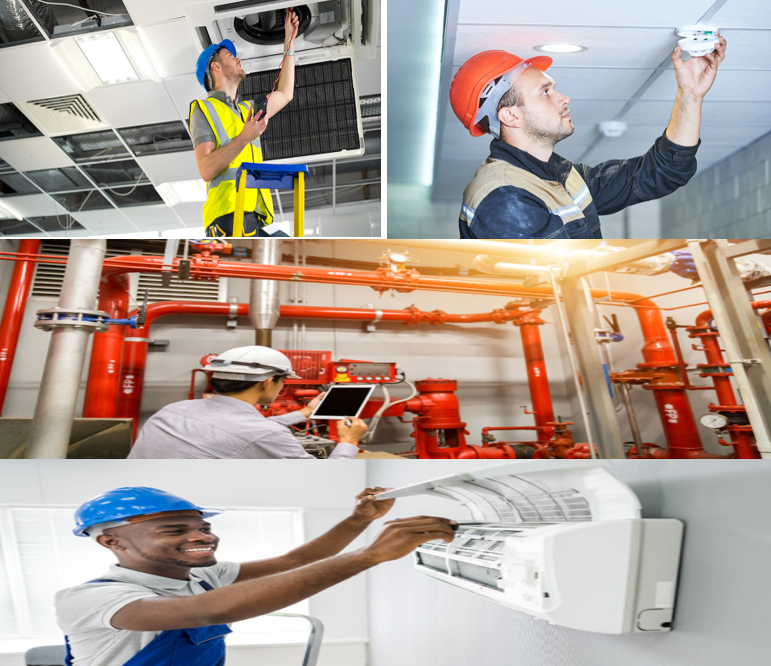 - Fire Suppression Systems: Inspection and maintenance of fire extinguishers, sprinkler systems, and fire pumps.